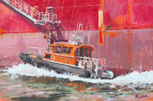 Many of Blazek’s original pieces are based on reference photos he took in Sabine Pass and other areas with heavy marine traffic. Pilots noticed these pieces at festivals, and eventually, Blazek met a pilot who offered to send him images to paint. This painting is based on one of those photographs.